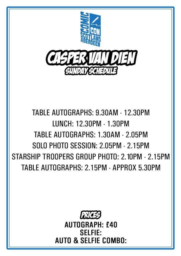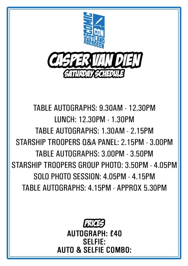 Casper Van Dien is best known for his defining role as Johnny Rico in the cult sci-fi classic “Starship Troopers.” His career spans action, drama, and fantasy, including roles in “Sleepy Hollow,” “The Omega Code,” and “Tarzan and the Lost City.” Casper has also directed and produced film projects, and continues to be a fan-favourite guest at conventions due to his enthusiasm for connecting with audiences.