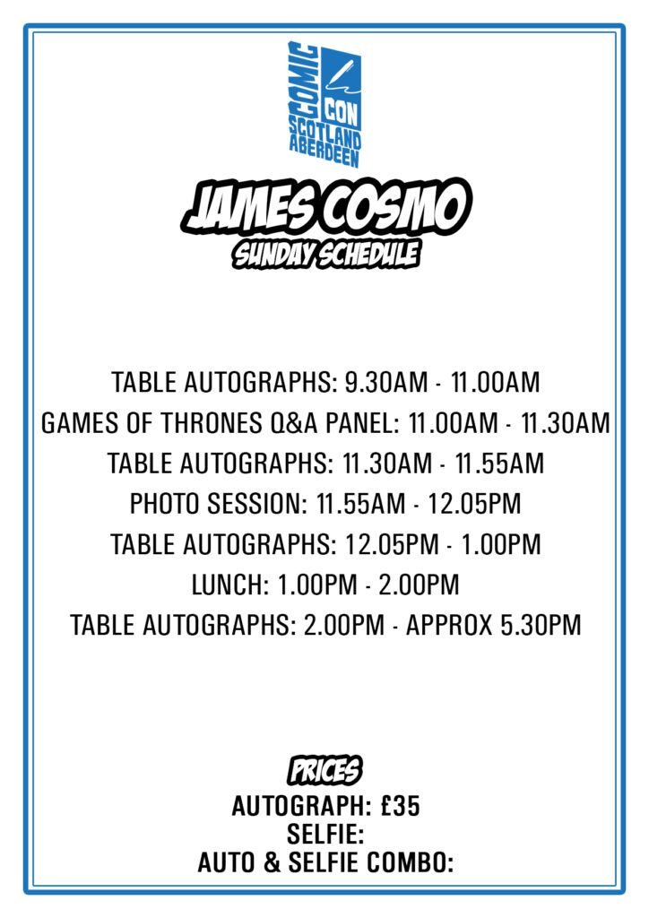 James Cosmo is a celebrated Scottish actor with a career spanning more than five decades in film and television. He is well known to fans for his role as Jeor Mormont, Lord Commander of the Night’s Watch, in the global hit series Game of Thrones. Cosmo has also appeared in major films including Braveheart, Highlander, and Trainspotting. His commanding screen presence and distinctive voice have made him a favourite among fans of fantasy, historical, and action cinema.